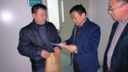集團工會主席把匯聚愛心的捐款送到職工王德峰手中