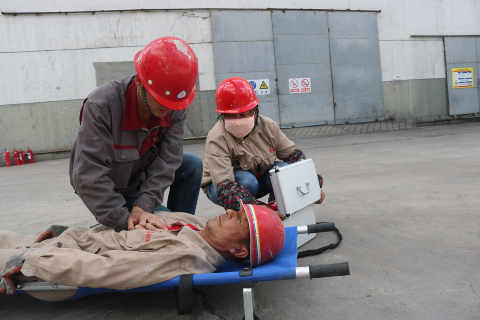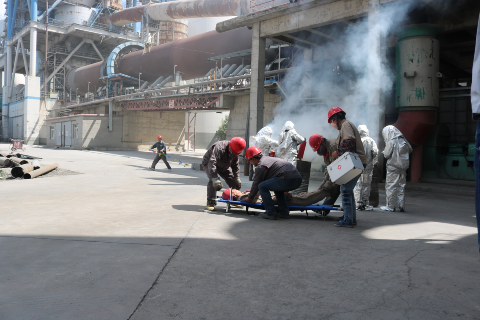 此次演練由生產(chǎn)部主任王克峰擔(dān)任救援總指揮,并設(shè)立安全警戒、水電控制、消防滅火、疏散搶救、醫(yī)療救護(hù)、后勤保障共6個(gè)救援小組,并設(shè)專人任組長。上午9:30分,全體演練人員在燒成車間窯中空?qǐng)鲞M(jìn)行集合。王克峰總指揮首先進(jìn)行了演練動(dòng)員,宣布了本次演練的組織機(jī)構(gòu)人員名單、職責(zé)及演練要求。隨著王克峰宣布演練正式開始,各組人員嚴(yán)格按照救援方案展開演練。安全警戒組和水電控制組立即設(shè)立警戒帶和切斷災(zāi)情區(qū)域及相關(guān)設(shè)施電源,消防滅火組迅速用滅火器對(duì)火災(zāi)現(xiàn)場進(jìn)行緊急滅火,疏散搶救組將災(zāi)區(qū)人員的重要物資進(jìn)行轉(zhuǎn)移并將傷員救出,隨后醫(yī)療救護(hù)小組在現(xiàn)場對(duì)傷員進(jìn)行了緊急救治,后勤保障組提供各項(xiàng)服務(wù)支持。各救援小組分工明確,反應(yīng)迅速,配合緊密,僅用了5分鐘便成功撲滅火災(zāi)將人員救出,在大家共同努力下此次演練圓滿成功。