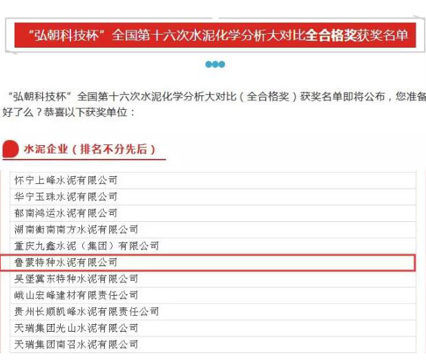 魯蒙水泥榮獲全國第十六次化學(xué)分析大對比“全合格”獎(jiǎng)項(xiàng)