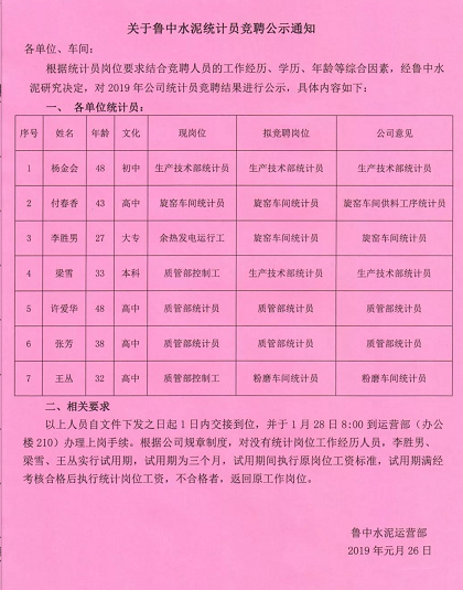 為強化成本精細化管理,提升成本管控水平。近日,魯中水泥組織開展統(tǒng)計員崗位公開競聘,此次競聘共有9人報名。根據(jù)統(tǒng)計員職責要求,針對競聘人員的工作經(jīng)歷、學歷、年齡等因素,選拔了7名統(tǒng)計員進行試崗。本次競聘充分體現(xiàn)了公司尊重能力、注重實績、公開競爭、擇優(yōu)選拔的用人導向,為工作中一貫表現(xiàn)優(yōu)秀的骨干員工和年輕員工,創(chuàng)造了良好的展示平臺和鍛煉機會。