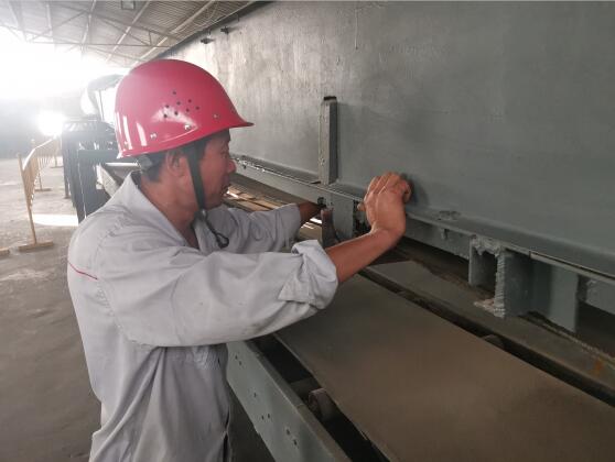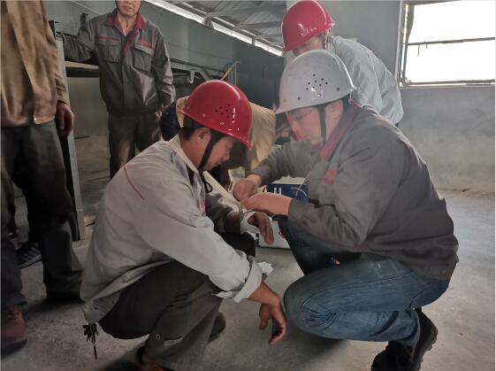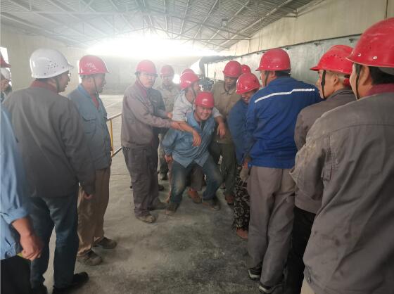 16:35,演練開始。粉磨車間副主任劉強接到通知,維修工在3#包機修理輸送皮帶時,操作工誤開啟設(shè)備,導(dǎo)致維修工左手夾在輸送皮帶與托輥之間,無法拿出。劉強隨即報告車間主任韓凱并趕往現(xiàn)場救援,同時韓凱召集各小組成員,啟動應(yīng)急救援預(yù)案,攜帶救援、醫(yī)療物資前往現(xiàn)場。經(jīng)過搶險救援小組現(xiàn)場搶救,受傷人員手臂從皮帶上取下,醫(yī)療救護組對傷員進行止血等簡單治療,然后送往醫(yī)院進一步治療。