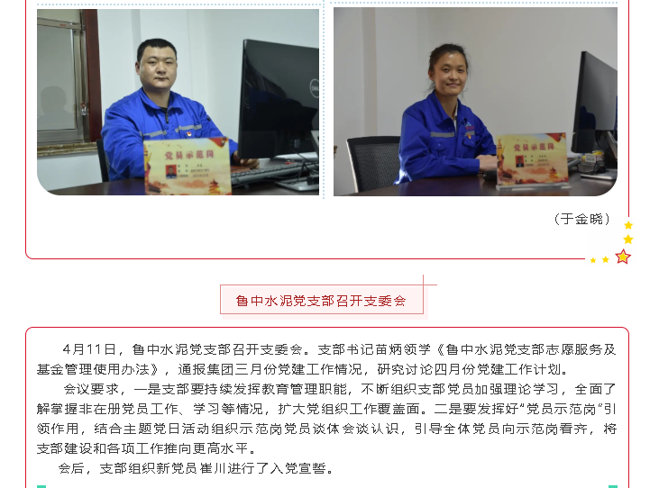 【黨建】魯中水泥黨支部選樹(shù)“黨員示范崗”;魯中、魯蒙水泥黨支部召開(kāi)支委會(huì)