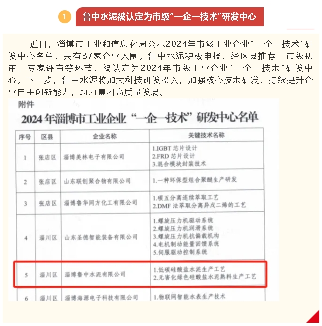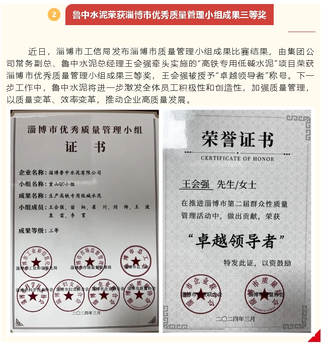 【榮譽】魯中水泥被認定為市級“一企一技術”研發(fā)中心、淄博市優(yōu)秀質量管理小組成果三等獎