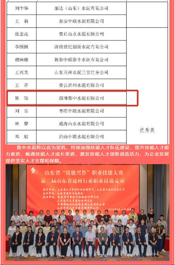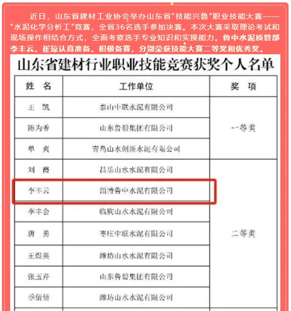 【榮譽(yù)】魯中水泥李豐云、崔瓊榮獲“技能興魯”技能大賽二等獎和優(yōu)秀獎