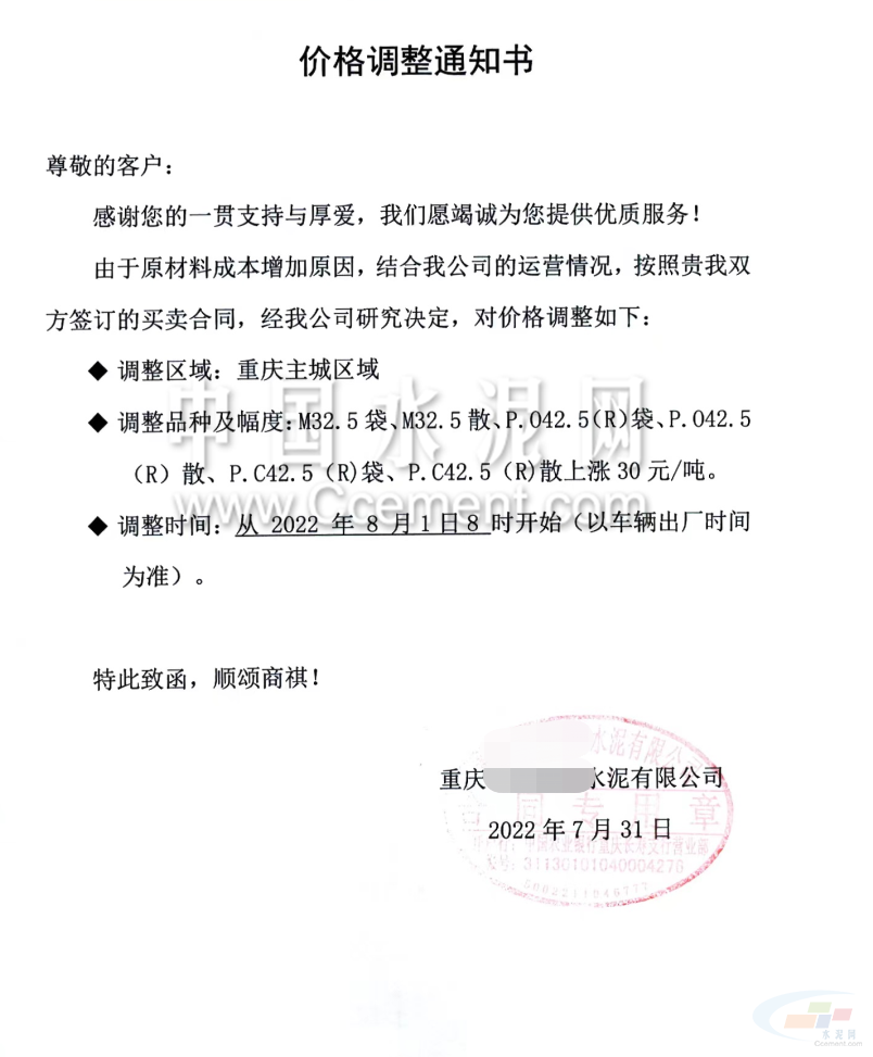 為提升盈利,8月1日起重慶地區(qū)一些廠家通知上調(diào)水泥價格30-50元/噸左右,主流漲幅30元/噸。目前廠家已發(fā)布調(diào)漲通知,具體落實情況有待觀察。