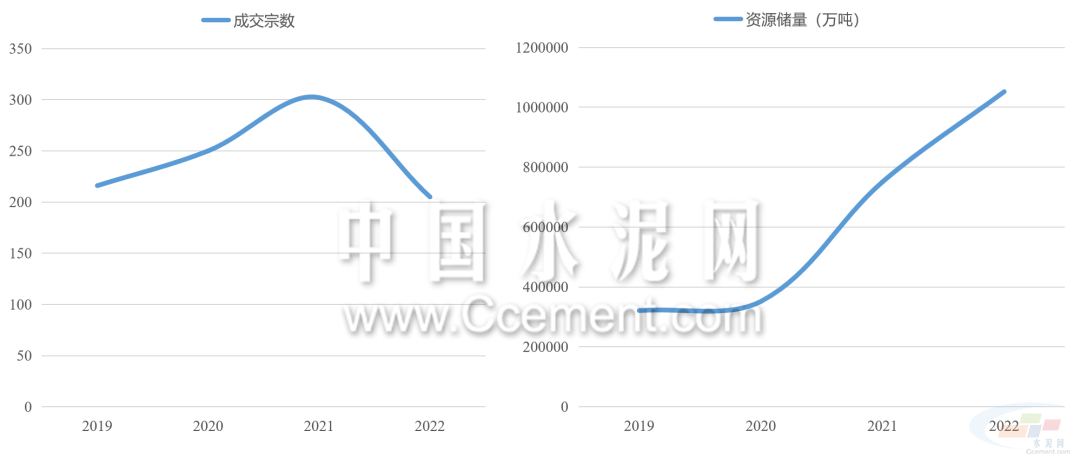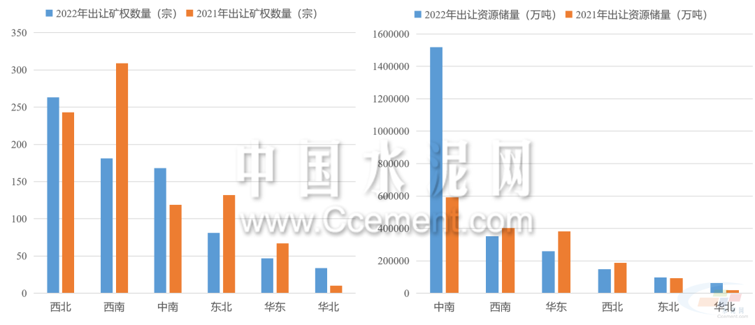 2022年礦權出讓呈現數量減少,儲量增長的特點。據目前已公布的礦權成交結果來看,2022年共有774宗型砂石礦權成交,同比減少12%,共計出讓資源儲量243.7億噸,同比增長超40%。中南地區(qū)是出讓礦權資源儲量最高的區(qū)域,占全國出讓資源儲量的六成以上,同比增長超150%。