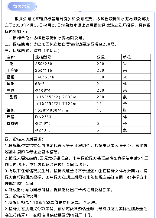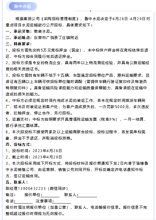 【招標(biāo)公告】魯中水泥、魯蒙水泥