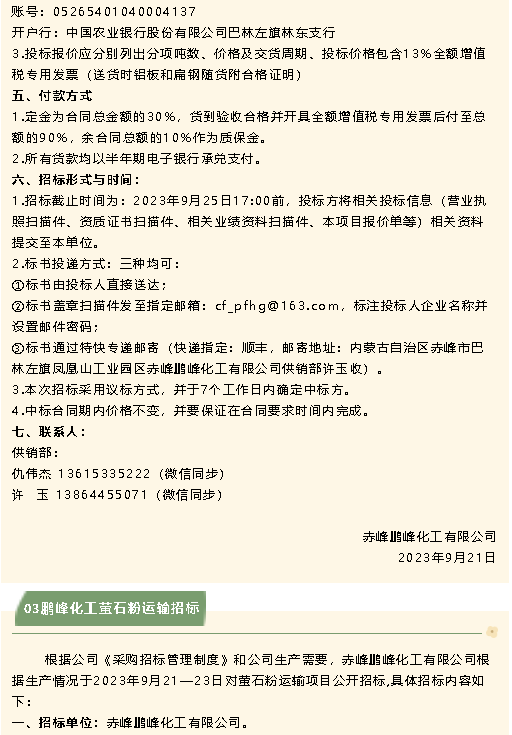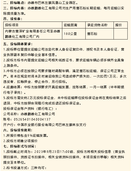 【招標(biāo)公告】鵬峰化工保溫材料、鋁板、扁鋼、螢石粉運(yùn)輸招標(biāo)