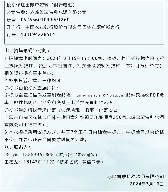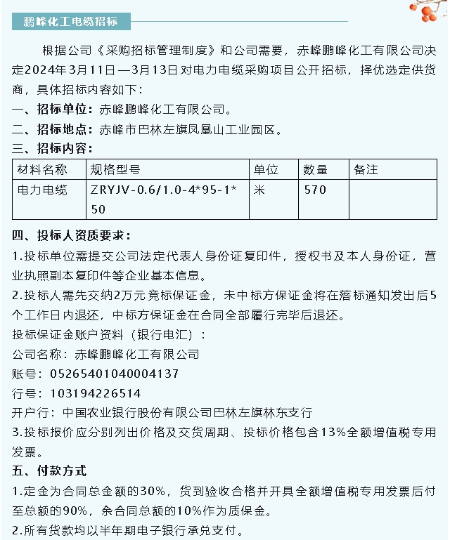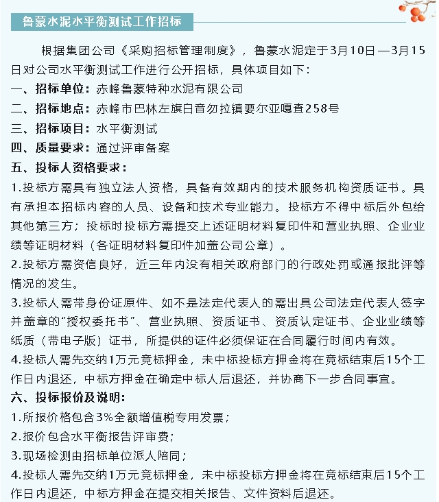 【招標公告】魯蒙水泥水平衡測試工作招標、鵬峰化工電纜招標