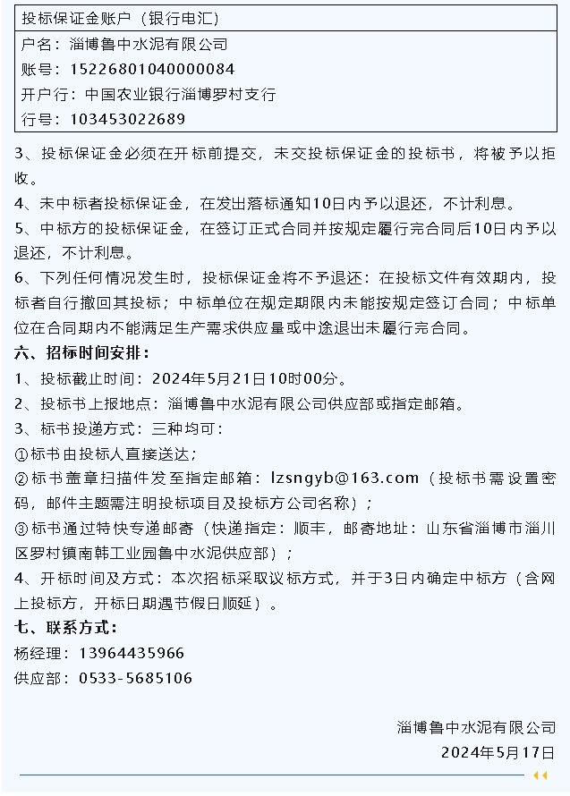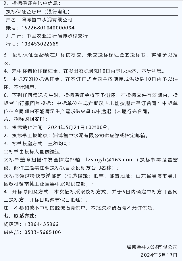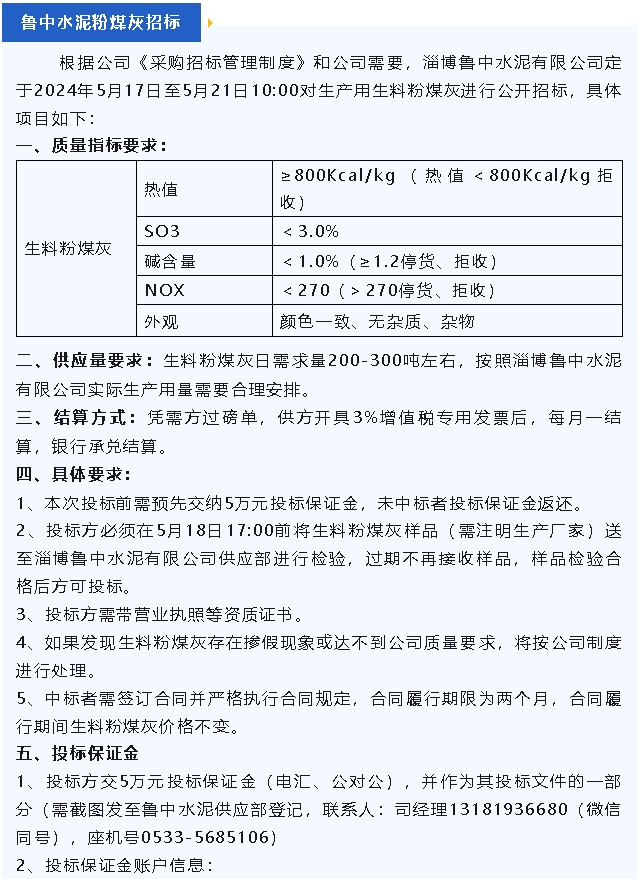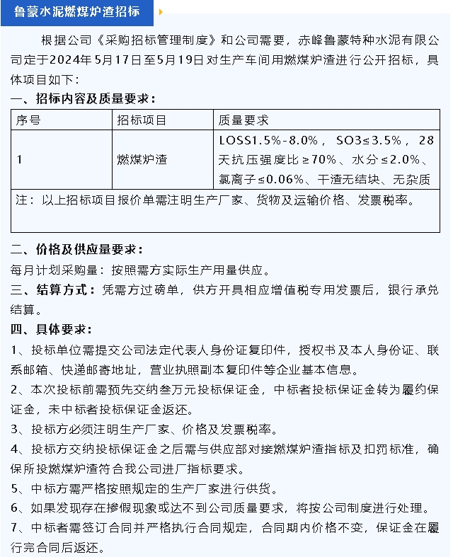 【招標(biāo)公告】魯蒙水泥燃煤爐渣,魯中水泥粉煤灰、脫硫石膏招標(biāo)