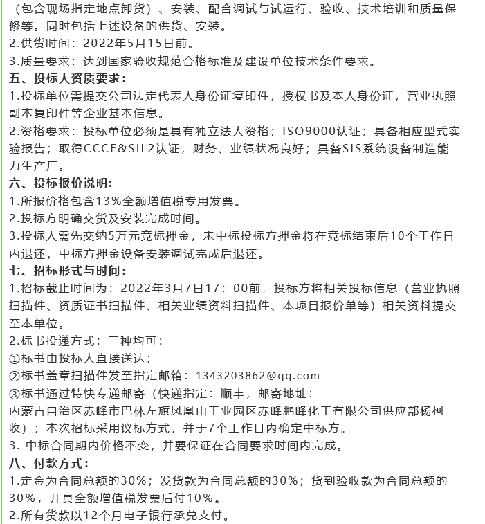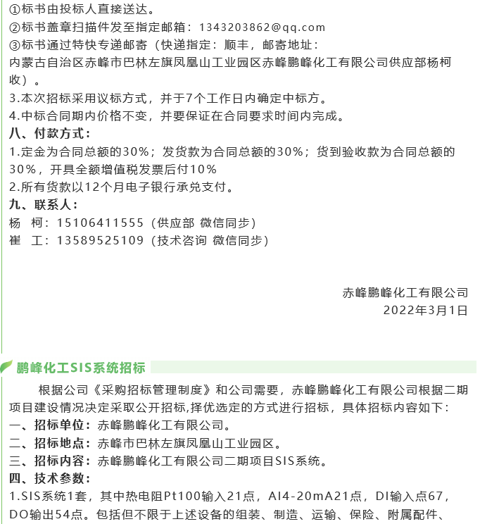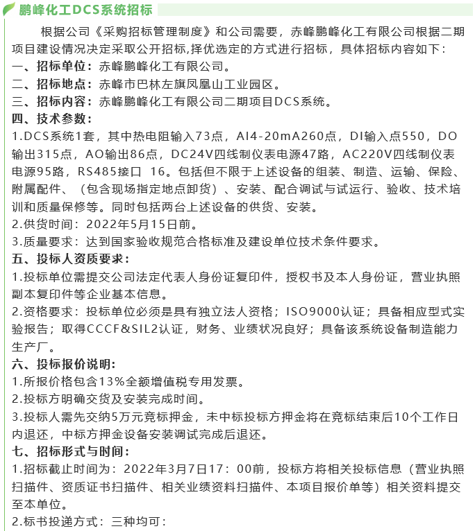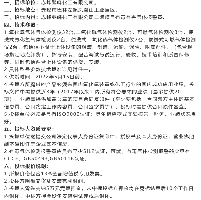 【招標(biāo)公告】 鵬峰化工SIS安全儀表、DCS系統(tǒng)、SIS系統(tǒng)、GDS系統(tǒng)、有毒有害氣體報(bào)警器招標(biāo)