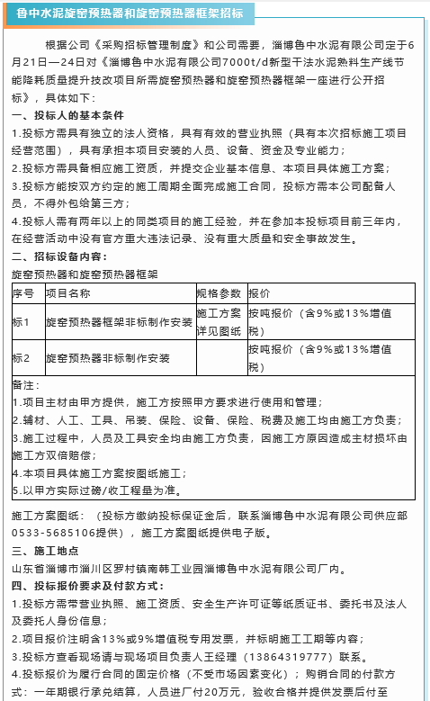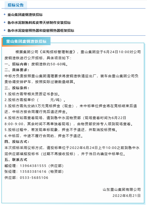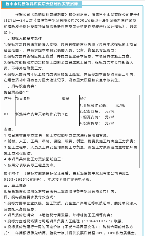 【招標(biāo)公告】重山集團(tuán)廢鋼渣鐵、魯中水泥新熟料庫皮帶天橋制作安裝、旋窯預(yù)熱器和旋窯預(yù)熱器框架招標(biāo)