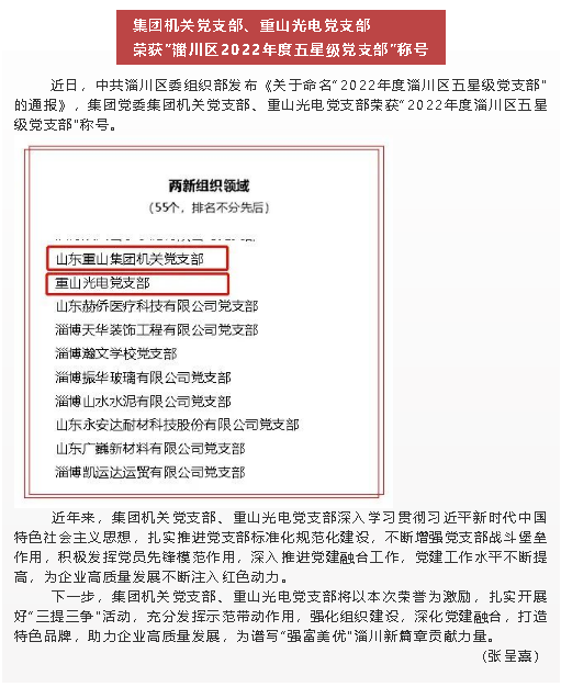 【黨建】集團(tuán)機(jī)關(guān)黨支部、重山光電黨支部榮獲“淄川區(qū)2022年度五星級(jí)黨支部”稱號(hào)