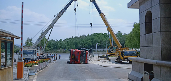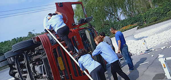 6月22日,正值大家正常工作的時(shí)間,一聲巨響打破了工作的寧?kù)o。102省道由東往西的一輛河北籍重型卡車(chē)為躲避突然掉頭的車(chē)輛向公司正門(mén)西側(cè)猛沖過(guò)來(lái),緊急的剎車(chē)讓車(chē)輛瞬間傾翻在地,滿(mǎn)載的數(shù)十噸石灰灑落一地。集團(tuán)總務(wù)處主任王宏得知消息立即向前查看詳情,側(cè)翻造成了駕駛室嚴(yán)重變形,貨車(chē)司機(jī)被困其中,無(wú)法動(dòng)彈,傷勢(shì)不明。安保隊(duì)員陳萬(wàn)鵬在第一時(shí)間撥打了120救助電話(huà)。怎樣把受傷人員從側(cè)翻變形的駕駛室中迅速救出來(lái)成了首先解決的難題。側(cè)翻的駕駛室目測(cè)有兩米高,需要搭梯才能進(jìn)入朝天的車(chē)門(mén),時(shí)間不等人,早一分鐘救出傷員,他們的生命就少一份危險(xiǎn),安保人員用被撞壞的欄桿代替腳梯,由兩名值班門(mén)衛(wèi)扶著欄桿,陳萬(wàn)鵬爬梯救人。頂著烈日,他不懼困難、奮力施救,汗水一滴一滴從頭上落下,侵透了衣衫,他顧不上抹去刺痛眼睛的汗水,心里只想著盡快把傷員救出。因?yàn)樨涇?chē)司機(jī)體型偏胖,又被方向盤(pán)牢牢的卡住,為了避免貨車(chē)司機(jī)受到二次傷害,只能利用現(xiàn)有的空間慢慢把傷員往上拖,經(jīng)過(guò)半個(gè)多小時(shí)的時(shí)間終于把貨車(chē)司機(jī)順利救出,120醫(yī)護(hù)人員立即將他送往醫(yī)院進(jìn)行救助。隨后,王宏、王立群協(xié)調(diào)粉磨車(chē)間的宋濤、供料車(chē)間的王新剛等單位領(lǐng)導(dǎo)分別帶領(lǐng)部分職工和兩臺(tái)裝載車(chē)在現(xiàn)場(chǎng)待命,救出傷員后清理現(xiàn)場(chǎng);協(xié)調(diào)的兩臺(tái)吊車(chē)待傷員救助后將側(cè)翻貨車(chē)吊起扶正,同時(shí)安保人員疏導(dǎo)現(xiàn)場(chǎng)交通,確保102省道和公司正門(mén)的交通安全。下午1:30左右,灑落的石灰清理完畢、側(cè)翻的貨車(chē)成功吊起扶正。救援結(jié)束后正值午時(shí),王宏安排兩名駕駛員到職工食堂就餐,細(xì)致入微的照顧讓兩名駕駛員感動(dòng)不已。身在異鄉(xiāng)的謀生者感到了如親人般的溫暖,他們激動(dòng)的握著王宏的雙手,表示真心的感謝。不善言談的貨車(chē)司機(jī)在晚上給王宏發(fā)了微信紅包,并對(duì)重山集團(tuán)的這次義務(wù)救援表示深深的感謝,王宏婉言謝絕了他的好意,向他表示:我們重山人做事都要對(duì)得起自己的良知,不求任何回報(bào)的。這是我們應(yīng)該做的。用實(shí)際行動(dòng)詮釋了致良知思想的內(nèi)涵和意義,充分體現(xiàn)了重山集團(tuán)的社會(huì)擔(dān)當(dāng)和致力構(gòu)建和諧社會(huì)的決心。
