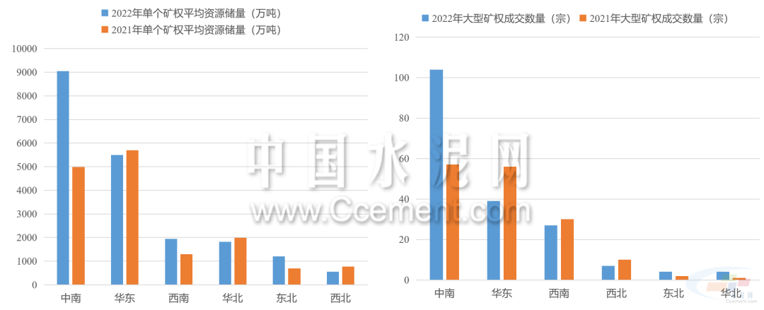 2022年礦權出讓呈現數量減少,儲量增長的特點。據目前已公布的礦權成交結果來看,2022年共有774宗型砂石礦權成交,同比減少12%,共計出讓資源儲量243.7億噸,同比增長超40%。中南地區(qū)是出讓礦權資源儲量最高的區(qū)域,占全國出讓資源儲量的六成以上,同比增長超150%。