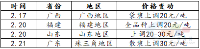 春節(jié)期間,多數(shù)地區(qū)放假停工,水泥企業(yè)進(jìn)行錯峰或檢修停產(chǎn),供應(yīng)出現(xiàn)下滑,庫存保持相對低位運(yùn)行,節(jié)后庫存壓力下降,企業(yè)漲價意愿強(qiáng)烈,華東、華南部分水泥大省開始零星調(diào)漲水泥價格。