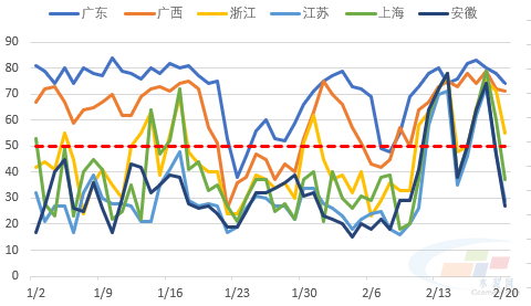 盡管今年市場漲價期比以往來得更早一些,但漲價的驅(qū)動力在供應(yīng)端,目前工人多數(shù)尚未返工,需求仍未啟動,需求依然羸弱,漲價基礎(chǔ)并不牢固。中國水泥網(wǎng)水泥大數(shù)據(jù)顯示,珠三角地區(qū)施工指數(shù)較高,施工條件適宜,而華東主要地區(qū)目前仍不適合施工。根據(jù)中國氣象臺數(shù)據(jù),2月底前長三角地區(qū)雨水天氣居多,北方地區(qū)氣溫偏低,市場整體難有起色。3月份南方地區(qū)隨著氣溫回暖,預(yù)計需求率先恢復(fù),但北方地區(qū)仍然滯后,加之“兩會”召開及項(xiàng)目部署和資金落地需要時間,預(yù)計今年一季度市場壓力較大。