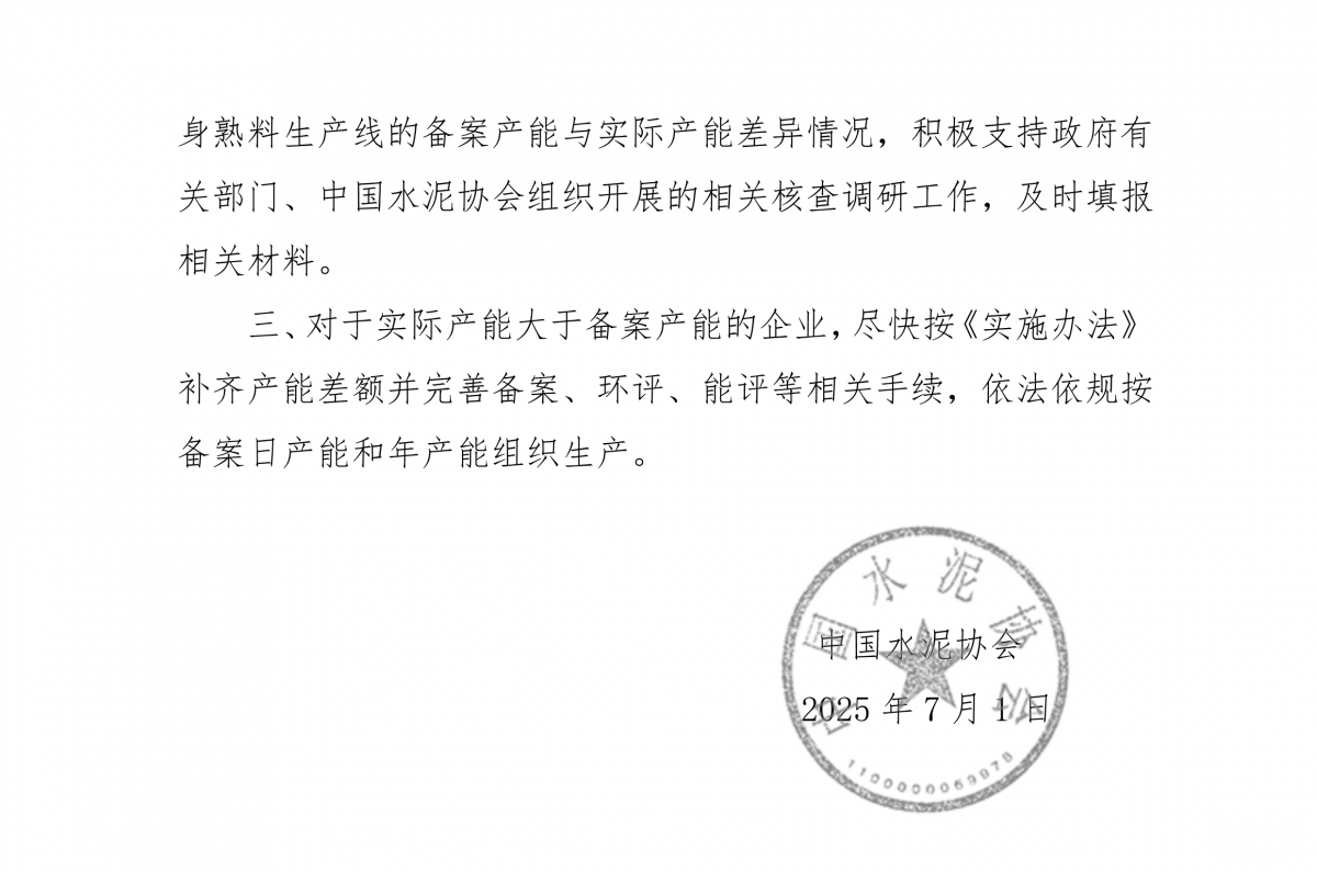 二、各企業(yè)要嚴(yán)格對照主管部門備案文件,逐條逐項核查自身熟料生產(chǎn)線的備案產(chǎn)能與實際產(chǎn)能差異情況,積極支持政府有關(guān)部門、中國水泥協(xié)會組織開展的相關(guān)核查調(diào)研工作,及時填報相關(guān)材料。