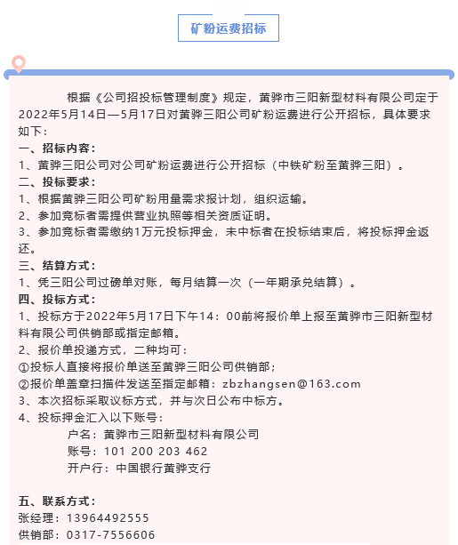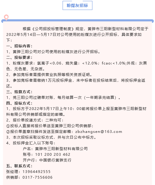 【招標(biāo)公告】黃驊三陽粉煤灰、礦粉運費招標(biāo)