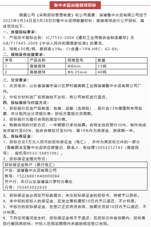 【招標(biāo)公告】魯中水泥高鉻微球、煙煤招標(biāo)