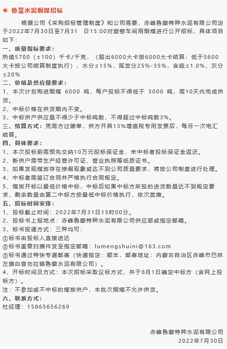 【招標(biāo)公告】魯蒙水泥煙煤,黃驊三陽球破磨機(jī)襯板、袋裝水泥編織袋,鵬峰化工鋼材招標(biāo)