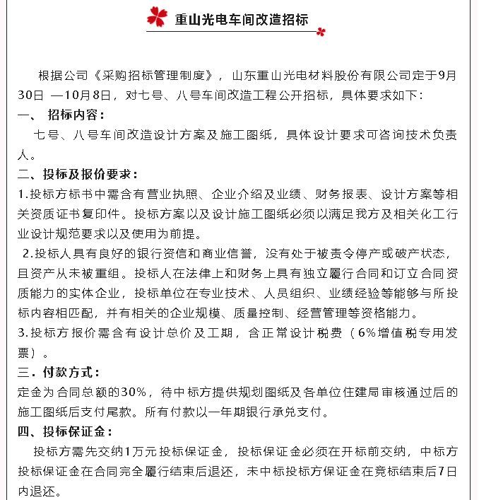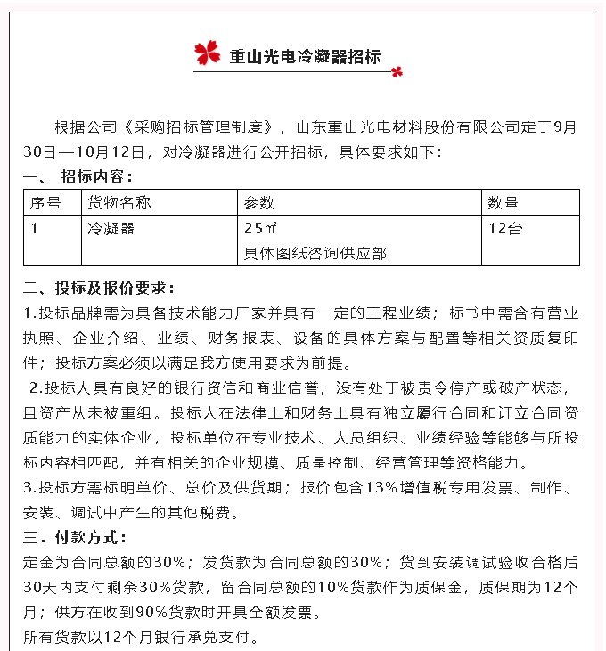 【招標公告】重山光電700L電解槽、車間改造、冷凝器招標